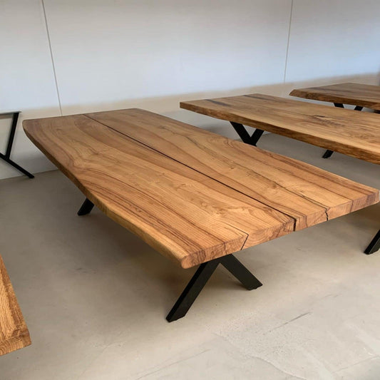 Samlinger, slibning og behandling udføres i flere trin, og vi dokumenterer processen, så du ved, hvad du får. Det er håndværk uden genveje – møbler, der patinerer smukt og fungerer i hverdagen, uanset om bordet bruges som skriveplads, samlingspunkt eller spisebord.