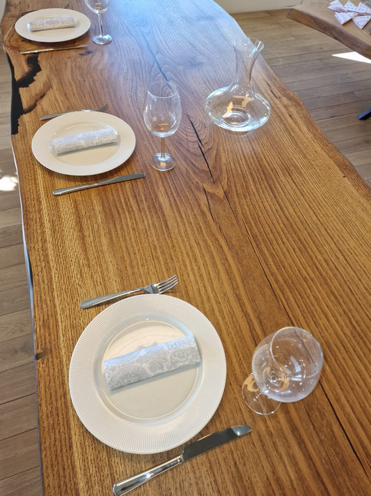 Vores modeller i eg, valnød, ask og fyr sorteres nøje efter stabilitet, farvespil og årestruktur, og vi fravælger planker, der ikke lever op til kravene. Når du vælger et plankebord i eg, får du den rolige, tidløse karakter, der gør bordet let at indrette omkring. Med valnød får du dybde og kontraster, mens ask tilfører et lyst, luftigt præg, og fyrretræ giver et varmt og rustikt udtryk.