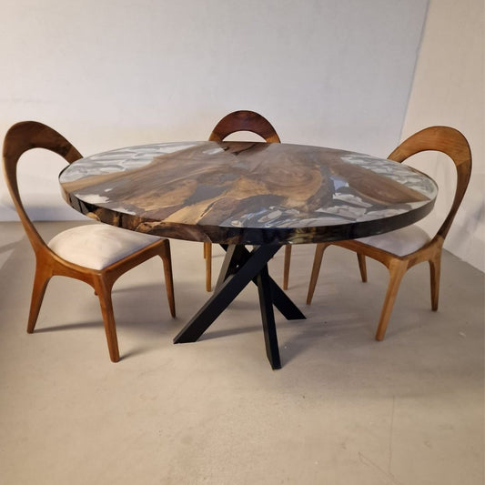 - Epoxy-borde kombinerer naturens rå struktur med et moderne twist og findes både i runde og aflange designs.
