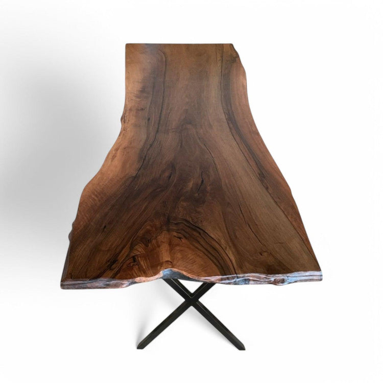 Unikt bord i én massiv valnødsplanke med naturkant og 6 cm tykkelse. Behandlet med Rubio Monocoat 2C olie – eksklusiv showroommodel klar til levering.