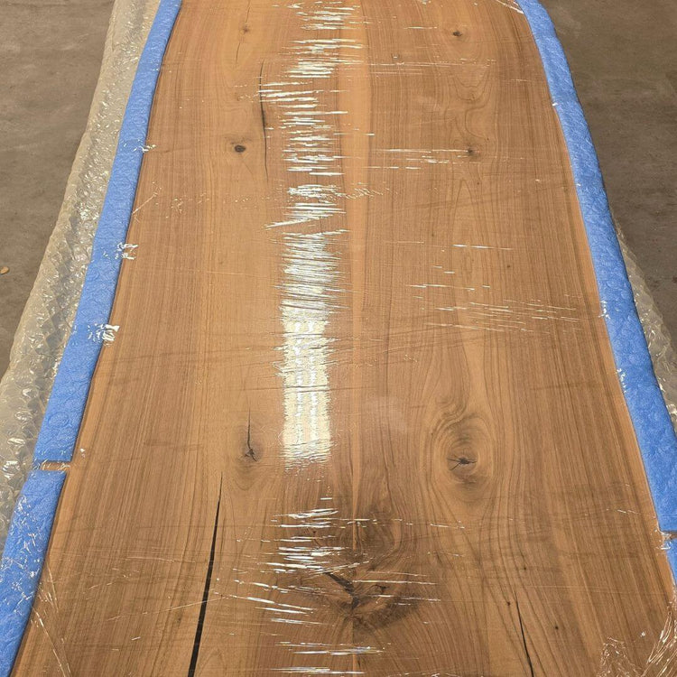 Planken på billedet vises i rå form. Den er endnu ikke færdigbehandlet og mangler kun den afsluttende slibning og oliering. Naturlige revner er allerede stabiliseret, så det færdige bord får både styrke og lang holdbarhed.