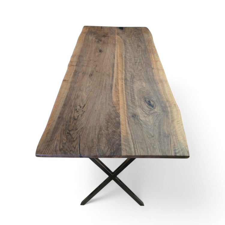 Bordet er bygget af to brede planker, der er nøje udvalgt og sammenlimet for at skabe en harmonisk, levende bordplade, hvor valnøddetræets karakteristiske åremønstre træder tydeligt frem.
