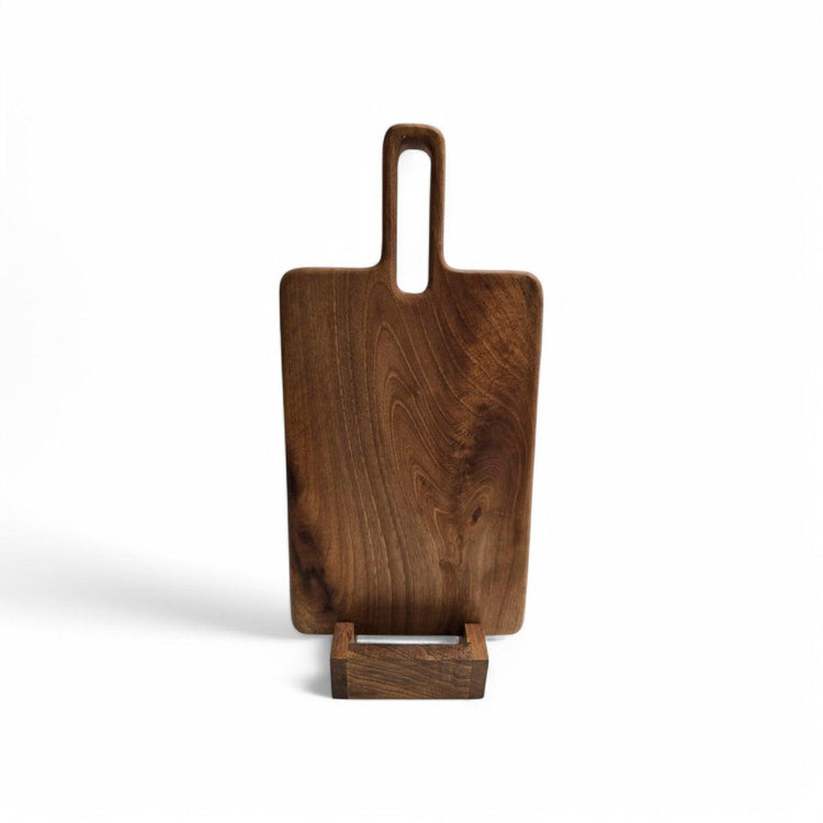 Skærebræt i massiv valnød med integreret håndtag – funktionelt, elegant og perfekt til både madlavning og servering.