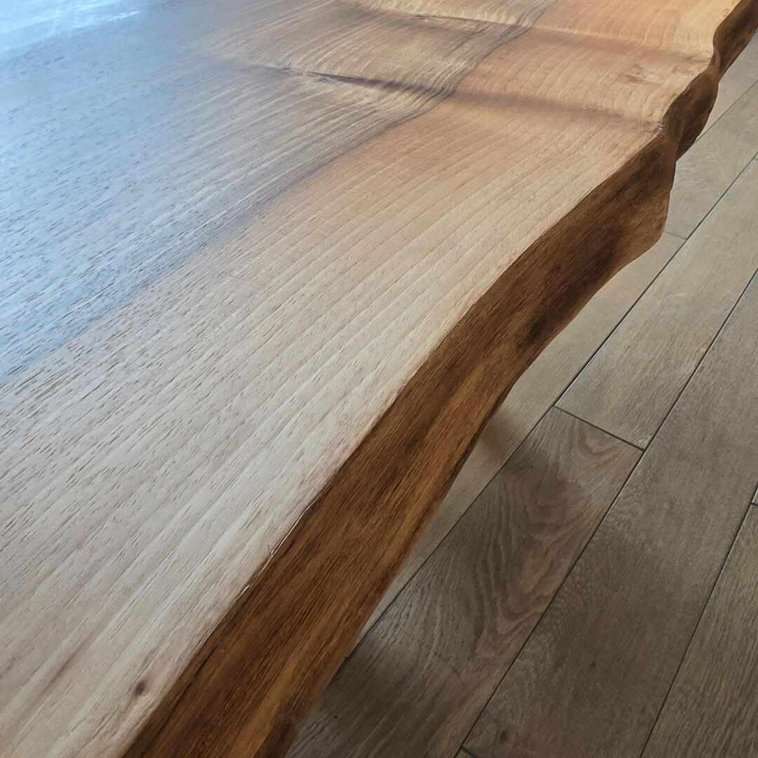 Den naturlige live edge-kant bevarer træets oprindelige form og giver bordet et helt unikt design, hvor ingen to eksemplarer nogensinde bliver ens.