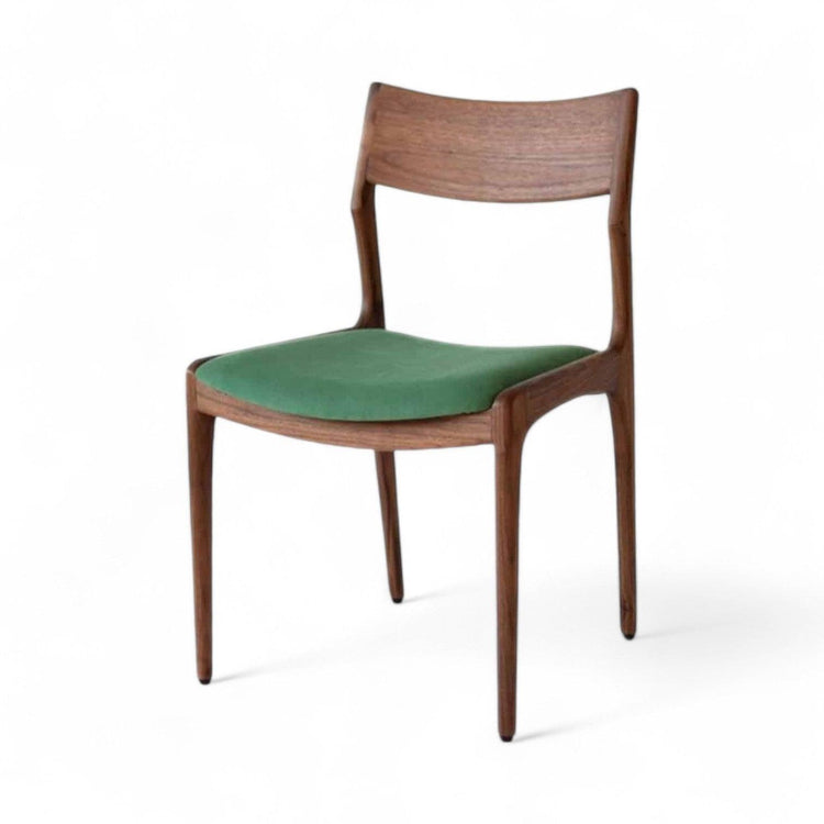 Elegant spisebordsstol i massivt valnød med sort polstret sæde. Tidløst dansk design med fokus på komfort og finesse.